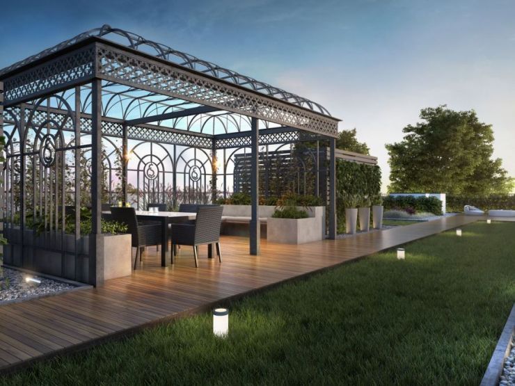ogród z altanami na dachu – idealne miejsce do relaksu.