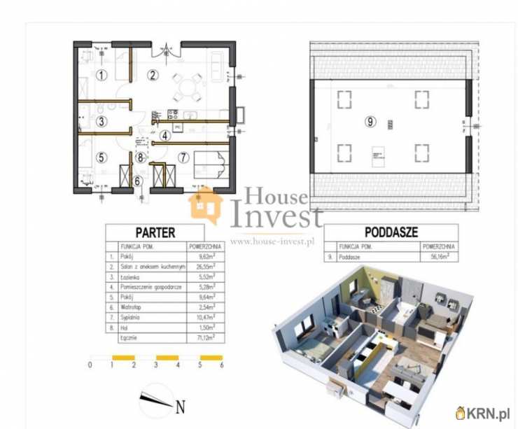 Na parterze znajdziemy przestronny salon z aneksem kuchennym, 3 pokoje, łazienkę, pomieszczenie gospodarcze oraz wiatrołap. II kondygnację stanowi natomiast poddasze o powierzchni 56,16 m2, które możemy dowolnie zagospodarować.