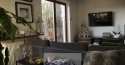 Wyjście z salonu na częściowo zadaszony taras z desek oraz do przytulnego ogródka