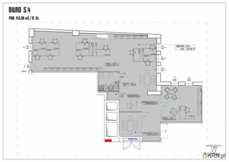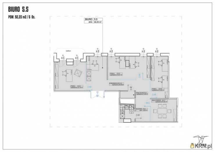 Lokal składa się ze strefy open space, 4 pokoi biurowych, 2 sali spotkań i recepcji. W biurze są dwa własne aneksy kuchenne, toalety znajdują się na częściach wspólnych. Powierzchnia biurowa przeznaczona do pracy dla około 18-20 osób. Dostępne jest miejsce parkingowe w garażu podziemnym w cenie 450 zł za miejsce.